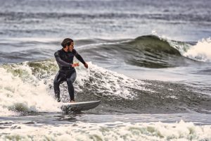 First you get a wetsuit that keeps you nice and warm in the water. Then we will choose a fitting surfboard for you.